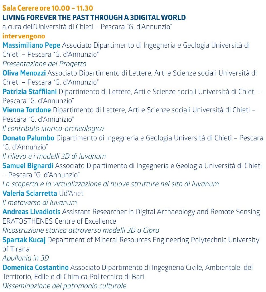 Durante l’evento verranno inoltre presentati i risultati del progetto Lip3D, con una sessione specifica dove interverranno archeologi, geomatici, architetti, geofisici ad esperti di Computer Science dall’Italia e dall’Europa.